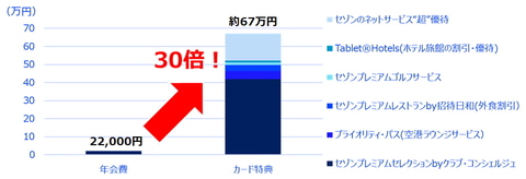 セゾンのポイントに対応する店舗でポイント還元を優待。富裕層向けサービスの「クラブ・コンシェルジュ」は、Web専用ページで申し込むと、入会金(220,000円)と年会費(198,000円)が無料になる。クラブ・コンシェルジュでは、ミシュラン星付き店の予約企画、通常では予約が難しい店の優先予約、水田やワイナリーのオーナーシップ特別販売、最先端医療や、子供のスイスサマースクール留学支援なども用意される。