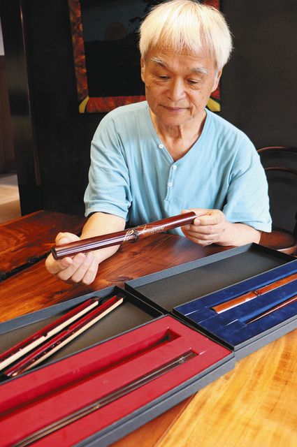 箸はケヤキなどを材料に用いる。箸箱は磁石で開閉する仕組みで、すす竹のほか、シノダケの箱など数種類のセットを用意する。材料や蒔絵に応じて価格は三万〜十万円を想定。ふるさと納税の返礼品としても市に提案したいという。