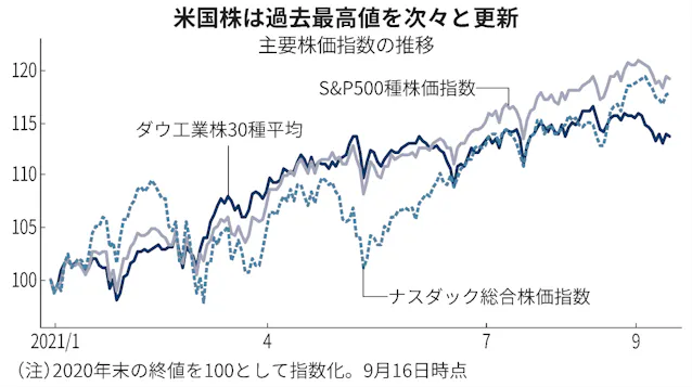 2021年の米国株は割高感を警戒する声をよそに過去最高値を次々と更新してきました。米連邦準備理事会(FRB)のジェローム・パウエル議長の講演が注目された8月下旬のジャクソンホール会議の後にも懸念された波乱は起きず、主要株価指数のS&P500種株価指数とナスダック総合株価指数は最高値を更新しました。