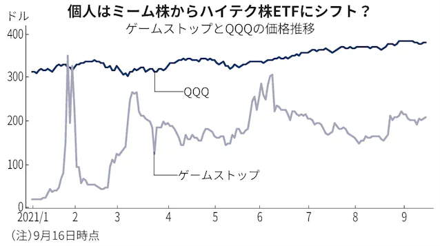 彼らの中には、ミーム株の急騰に刺激されて株式投資で一獲千金を求める中間層以下の投資家が多くいます。もっとも、ネット上の話題の分析サイトによると、最近はミーム株への言及は急減し、ハイテク株が多いナスダックの時価総額の大きい銘柄の指数に連動するETF(上場投信)「QQQ」への言及が多くなっています。彼らの関心はミーム株からGAFAMなどの主要ハイテク株にシフトした可能性があります。